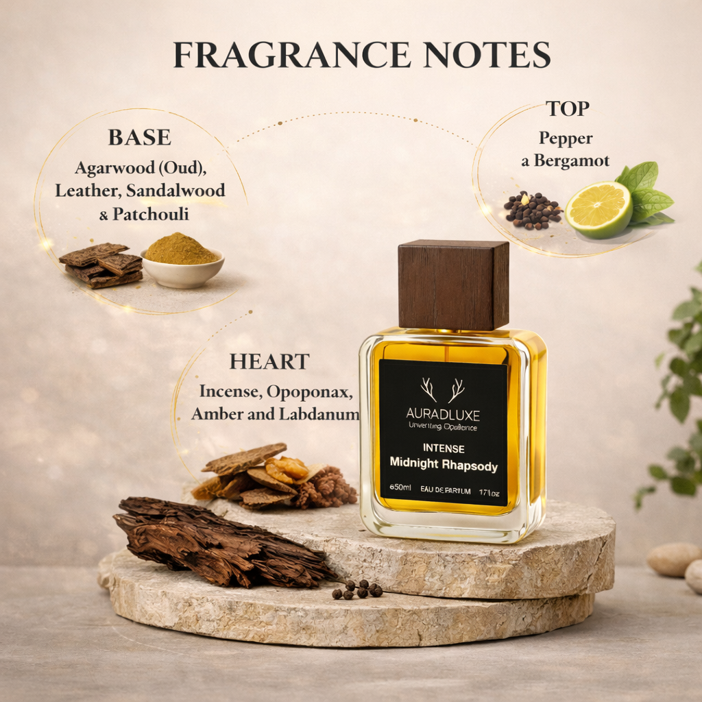 The fragrance opens with the bold freshness of Pepper and Bergamot, flows into a warm heart of Incense, Opoponax, Amber, and Labdanum, and settles into a deep, luxurious base of Agarwood (Oud), Leather, Sandalwood, and Patchouli.