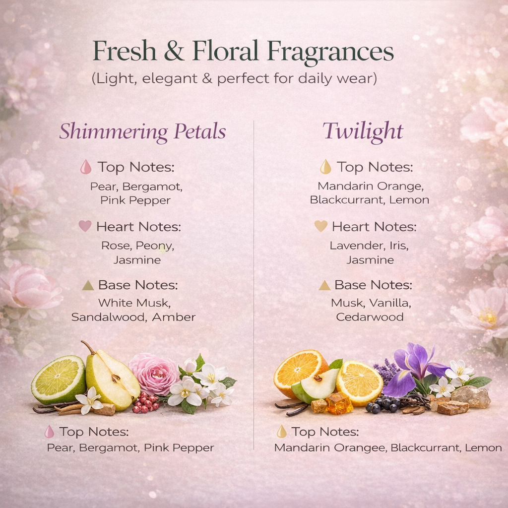 A premium Eau de Parfum Discovery Set for Women (4 × 15ml), specially crafted for Indian tropical weather, offering 9–10 hours of lasting freshness with a 25%–30% perfume concentration. Designed to blend elegance, sophistication, and versatility in a travel-friendly size.